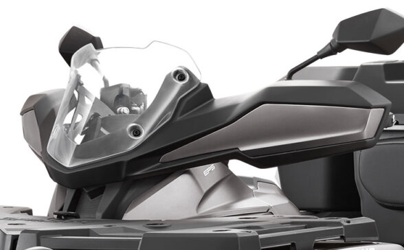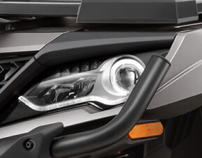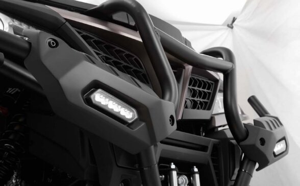 Агресивний вигляд CFORCE 1000 OVERLAND підкреслюється міцними сталевими бамперами спереду і ззаду. Товста сталева труба діаметром 38 мм, вкрита антикорозійним покриттям, захищає передню решітку радіатора і фари від будь-яких неприємностей, які може готувати для вас бездоріжжя. Дві світлодіодних прожекторних фари потужністю 18 Вт покращують можливості в умовах недостатнього освітлення та додають квадроциклу грізного вигляду.
