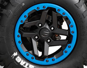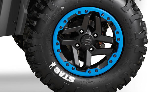 14-дюймові алюмінієві колісні диски з бедлоками входять у стандартну комплектацію CFORCE 1000 OVERLAND. Високоякісні алюмінієві бортові кільця, що кріпляться 16 болтами, забезпечують надійне прилягання диска до колеса, уможливлюючи підтримання низького тиску повітря для створення більш широкої площі контакту колеса з опорною поверхнею і кращого зчеплення. Дозвольте міцним 27-дюймовим шинам гризти пересічену місцевість, поки ваша опора залишається надійною, а двигун об’ємом 1000 куб.см рухає вас вперед.