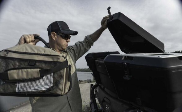 Вирушайте у свою багатоденну подорож на квадроциклі CFORCE 1000 OVERLAND, адже він має достатньо місця для всього, що вам потрібно в дорозі. Два багажні короби преміум-класу загальною місткістю 146 літрів (105 л + 41 л) легко встановлюються без необхідності будь-яких модифікацій. Центральний короб місткістю 41 л має зручні накладки для водія, а якщо його зняти, ви отримаєте ергономічне пасажирське сидіння. Погодостійкість (IP56) означає, що ваші речі залишатимуться сухими і захищеними від води та пилу протягом усієї подорожі.